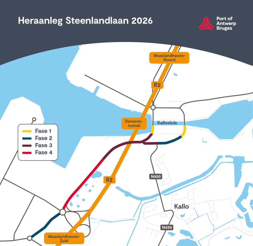 | Omdat de Steenlandlaan een belangrijke weg voor doorgaand verkeer in de Waaslandhaven is, organiseren Port of Antwerp-Bruges, VOKA Kamer van Koophandel Antwerpen-Waasland en Alfaport-VOKA een webinar om de fasering en timing van de werken en de impact ervan uit te leggen. Dit webinar gaat door op 22 januari 2026 van 11 tot 12 uur. Inschrijven kan via: https://event.portofantwerpbruges.com/Webinar_heraanleg_Steenlandlaan. |